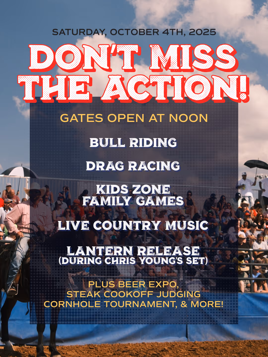Stars of Texas turns up the heat with bull riding, BBQ, and a stacked concert lineup including Chris Young, Ashley McBryde, Ned LeDoux, and Coffey Anderson. Plus: jet cars, match races, and a lantern release under the stars.